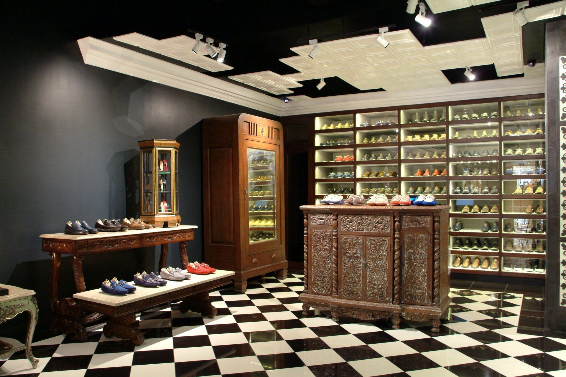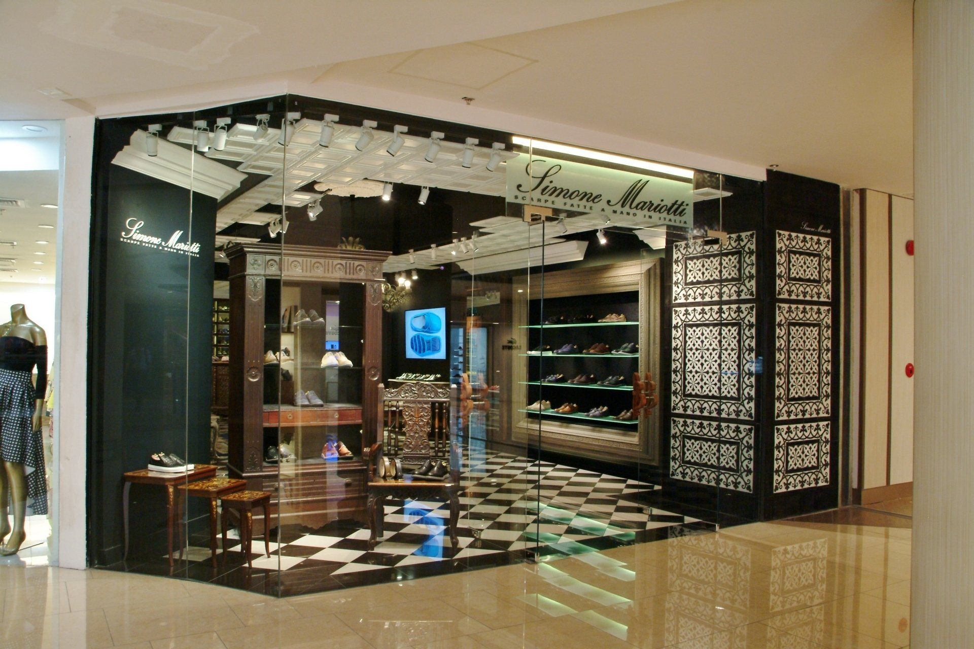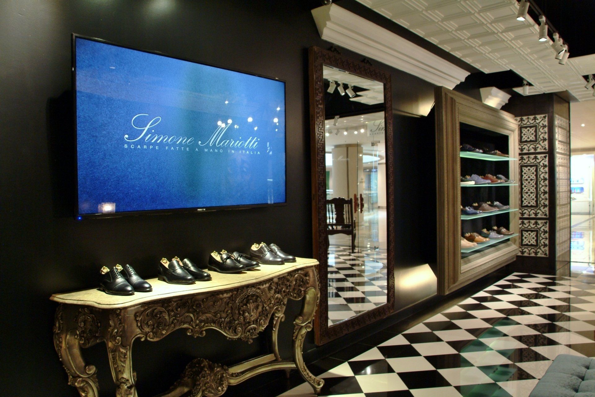 Simone Mariotti used high-end, creative materials on unique furniture pieces to showcase their genuine leather shoes made in Italy.
