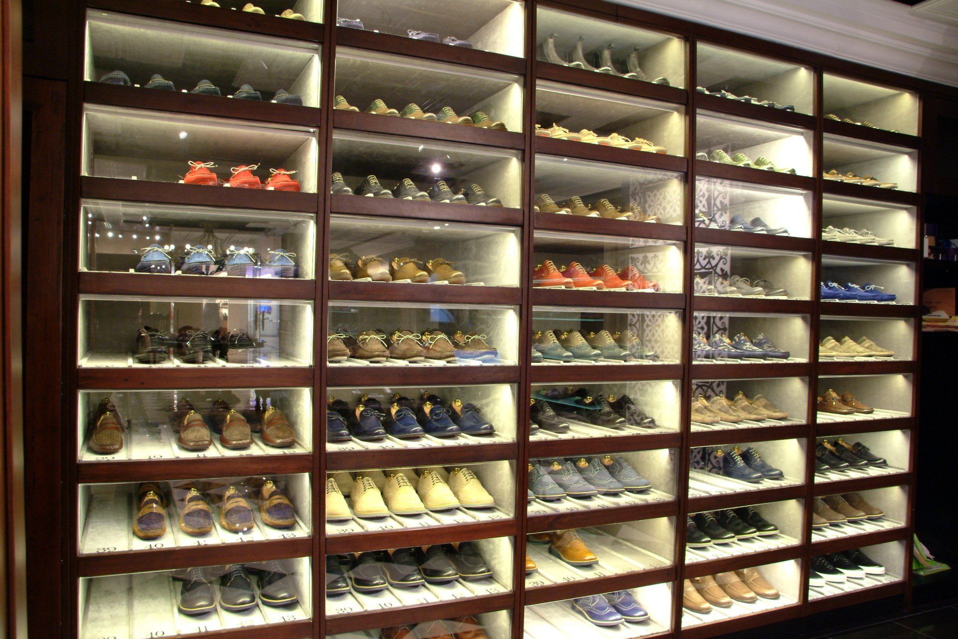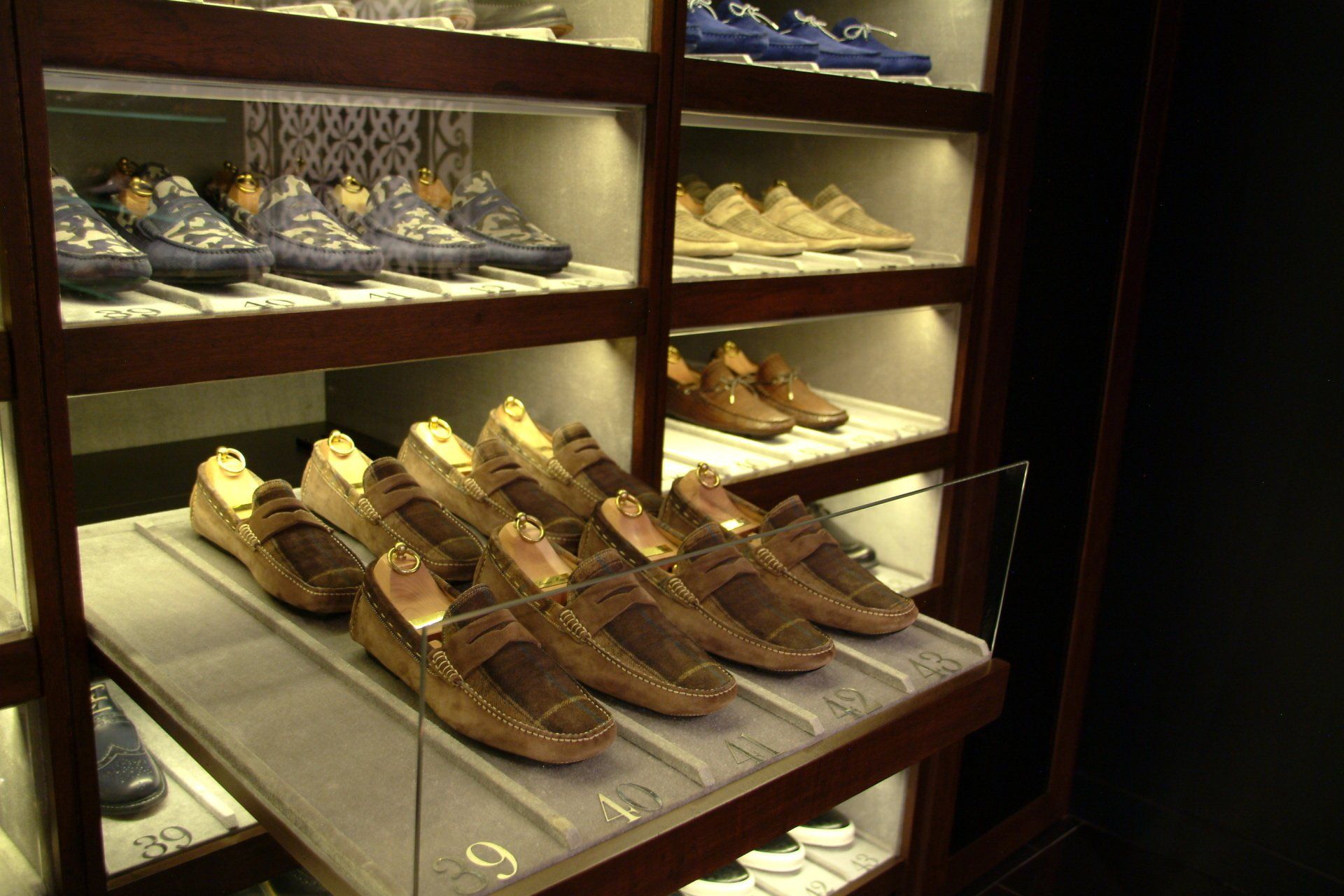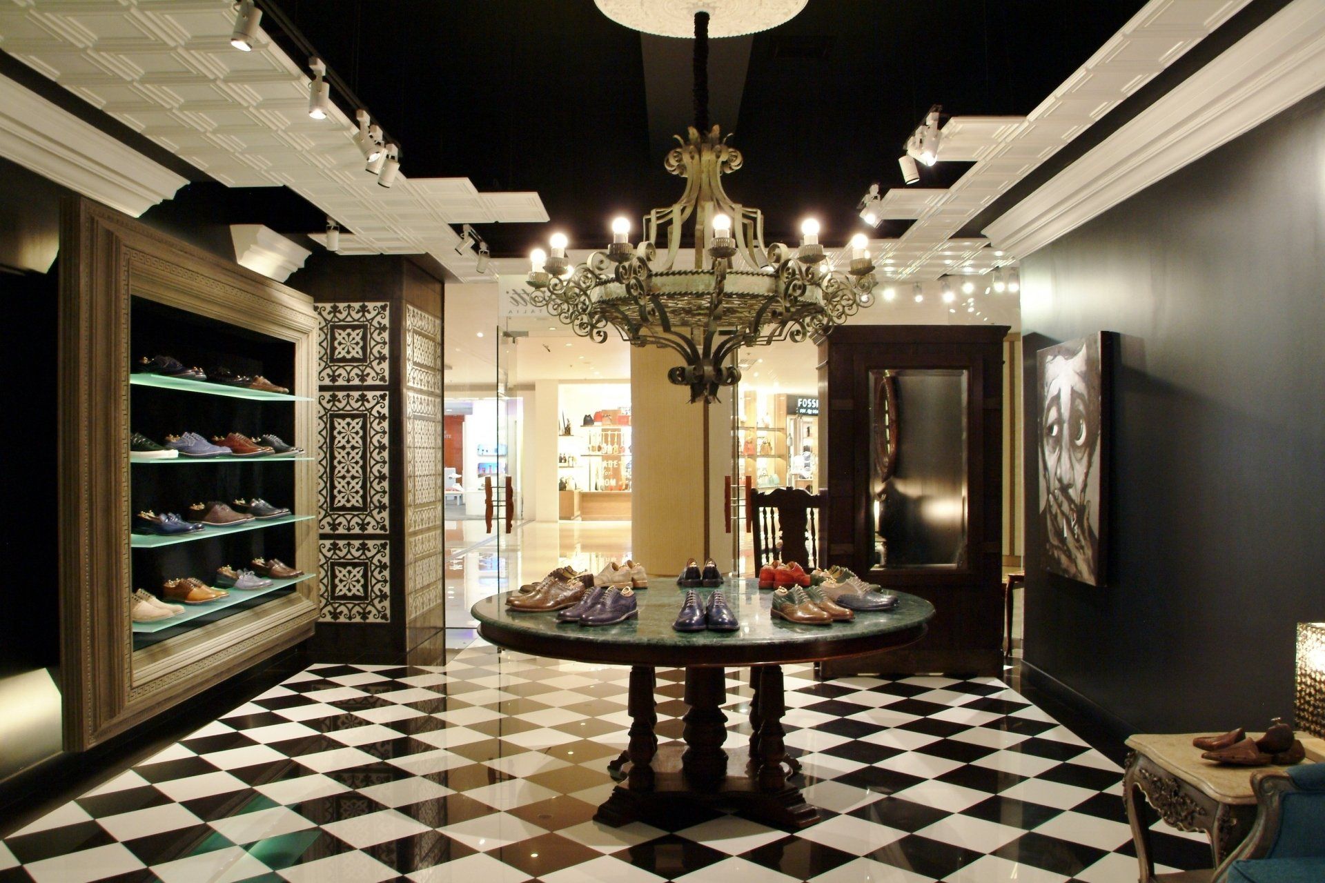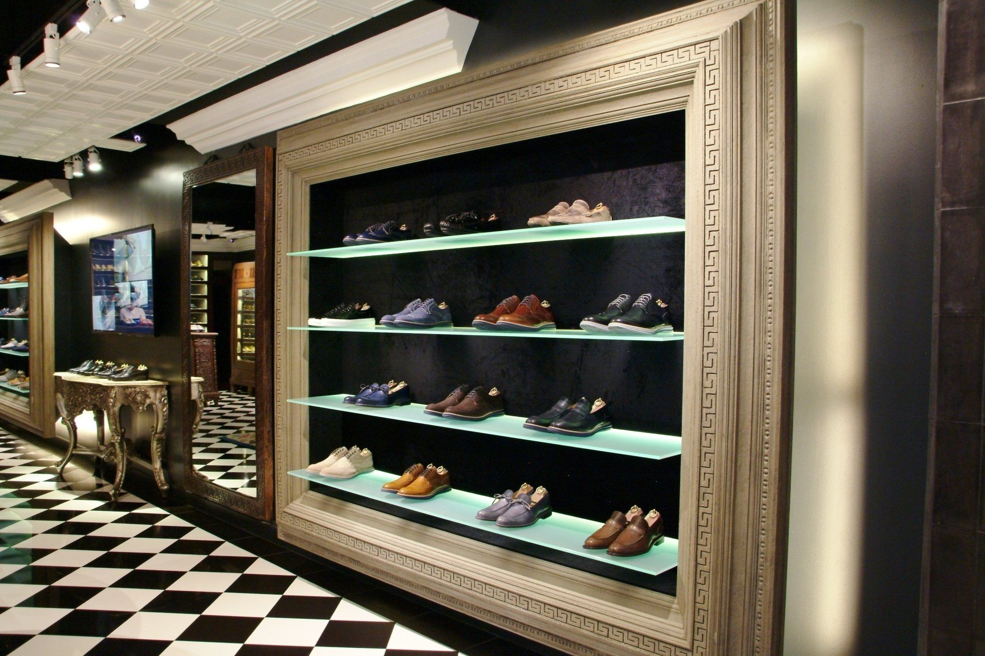 Simone Mariotti used high-end, creative materials on unique furniture pieces to showcase their genuine leather shoes made in Italy.